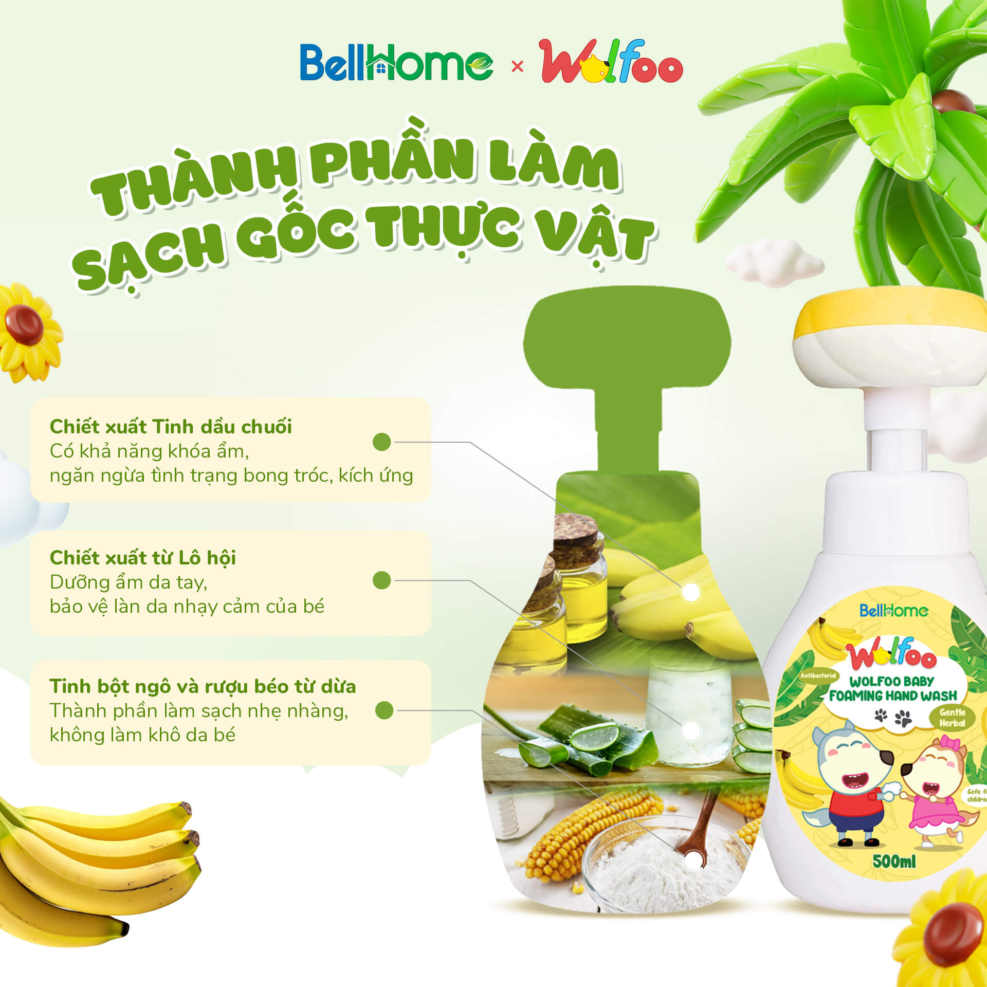 Để cha mẹ an tâm rửa tay cho bé ngay từ những tháng đầu đời, Bell Home đã cho ra đời sản phẩm Bọt Rửa Tay Cho Bé Wolfoo Baby với thành phần làm sạch gốc thực vật, giúp làm sạch nhẹ nhàng, bảo vệ sức khỏe bé tối ưu.