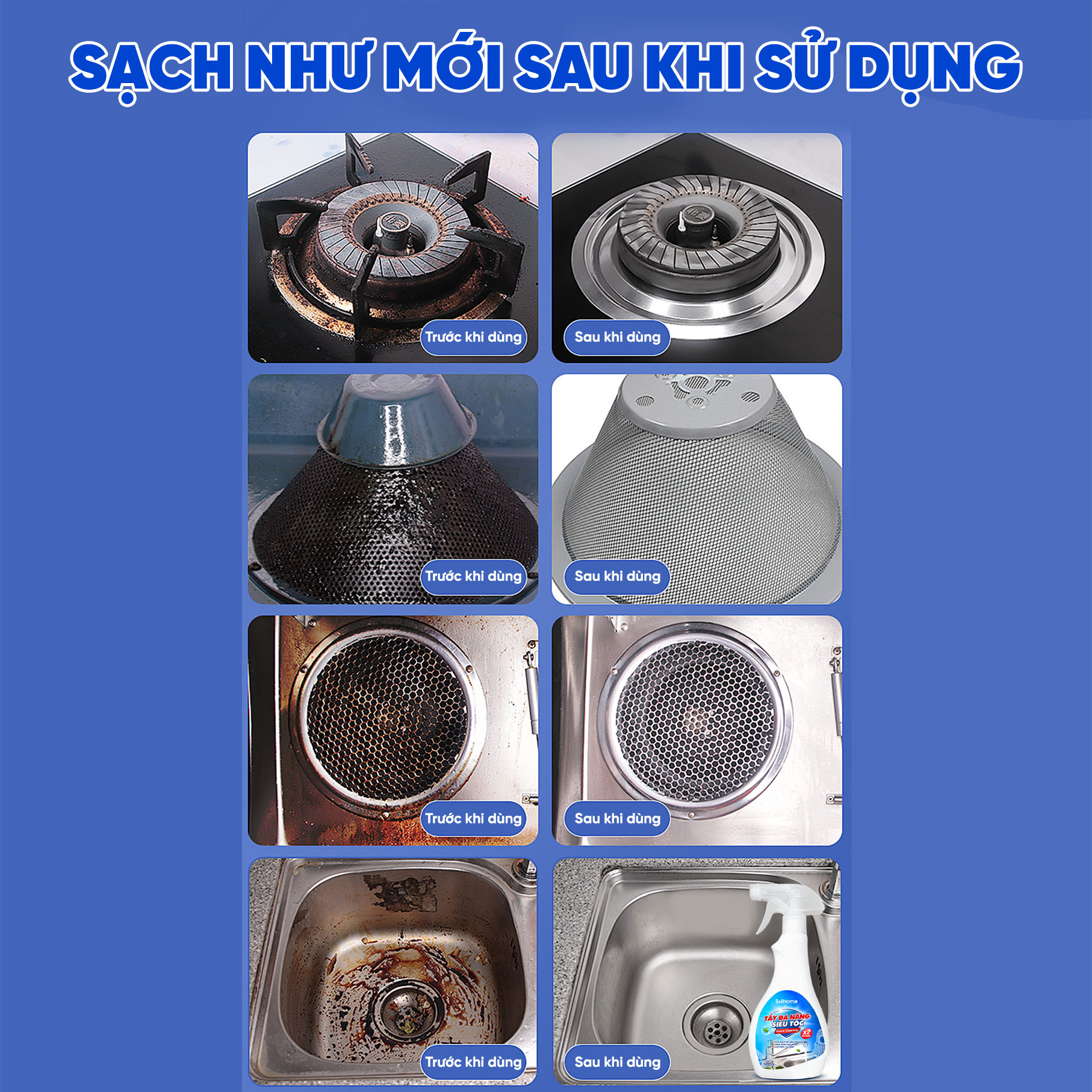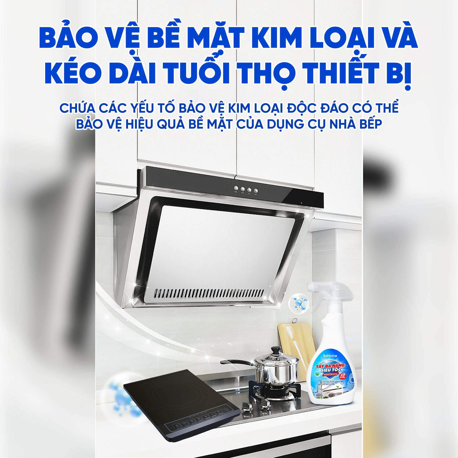 Tẩy đa năng siêu tốc BellHome sở hữu công thức enzyme sinh học và hoạt chất làm sạch tiên tiến, dễ dàng đánh bay mọi vết bẩn cứng đầu chỉ sau 1 lần lau. Từ vết cháy khét trên đáy nồi, rỉ sét trên kim loại, đến lớp dầu mỡ lâu ngày bám trên bề mặt bếp, xoong nồi hay thiết bị nhà bếp - tất cả đều được làm sạch nhanh chóng mà không cần chà mạnh tay.